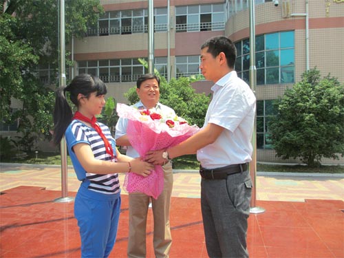 謝兵在事發現場接受當地媒體采訪 看到跳河女開始大口吐出嗆進去的河水,渾身濕透的謝兵掕起自己的鞋子上了車,不聲不響地離開了現場。 被救的婦女姓李,在大生社區開了一家小吃店,因為生活瑣事,一時想不開跳河輕生。事后,她對自己的魯莽行為后悔不已,同時也對救命恩人的義舉感激零涕:“要不是這個好心人,說不定這個時候都送到火葬場了。” 絕非偶然,英雄從小樂于助人 “那條河三米多深呢,根本踩不到底啊,救人的這個小伙子真的不簡單。”當時在橋上拼命呼救的鞠女士感慨地說。但是這個小伙子是誰? 事發后,附近的大生小學老師朱振東也趕到了現場。“小伙子好像是誰家的女婿……”、“他的岳父就在附近的通江路上做鋼材生意。”“他好像是個老師,他的車子是寶馬X3”。朱振東綜合這些信息,四處打聽小伙子的姓名和單位,最終通過他調到鼓樓小學的同事熊立新,查證了這個救人英雄就是泰興市鼓樓小學體育教師謝兵。 “作為一名社會公民,同時作為一名人民教師,謝兵路遇險情,舍己救人,我們覺得絕非偶然,這與他的自身素質有著密切的關系。”面對社會各界的贊譽,泰興市鼓樓小學校長姚恒章如是說。