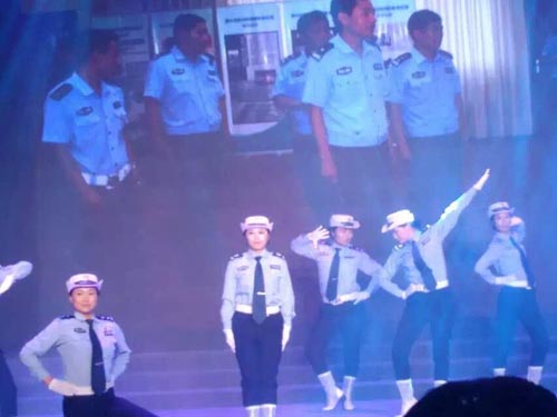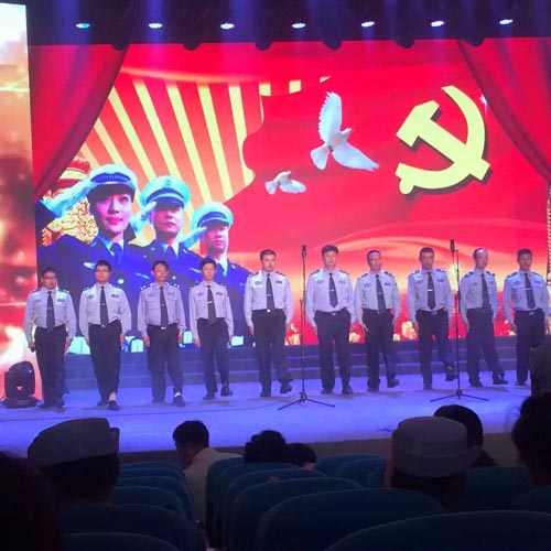 活動首先由泰興市610辦公室主任、市公安黨委委員、副局長蔡林致辭,文藝匯演在《歡聚一堂》中正式拉開帷幕,《迎風(fēng)飄揚的旗》、《團結(jié)就是力量》12名小伙精神抖擻、英姿颯爽;《海燕》展現(xiàn)了我黨披荊斬棘,踏浪前進的豪邁;《精忠報國》表達了所有黨員民警拳拳愛國心;《血染的風(fēng)采》、展示了黨員家庭舍小家為大家的情懷;《戰(zhàn)豆》三個小朋友來自民警家庭的小朋友則成為了萌萌可愛的接班人;作為反面教材的《鐵窗淚》對黨員民警加以警醒;“都知道公安民警不容易…里面的酸甜苦辣,只有身在其中的我們最清楚。不過,我們又是幸運的…”這些民警平日不輕易表露的心聲在演出民警動情的朗誦中娓娓道來,立刻引起了現(xiàn)場強烈的共鳴;女警 T臺秀《舞蹈串燒:小蘋果》一下子讓現(xiàn)場瞬間沸騰,9名身著戎裝的女警高調(diào)登場,英姿颯爽的動作透著柔美和自信,展現(xiàn)出新區(qū)女警巾幗不讓須眉的豪情壯志 .....一支支紅歌唱出了黨員民警的心聲,一曲曲舞蹈舞出了對黨的無比熱愛。《我和我的祖國》、《紅梅贊》等等節(jié)目充分體現(xiàn)了基層民警從自身做起,爭做優(yōu)秀黨員,全心服務(wù)百姓的良好精神風(fēng)貌。最后,一曲壓軸的全體人員聯(lián)唱《國際歌》把文藝匯演推上了高潮,也為整場演出畫上了一個完美的句號。