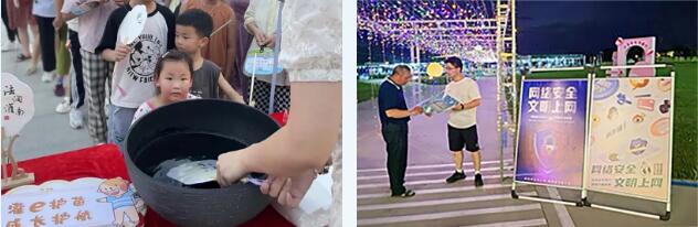 在連云港灌南縣鹽河體育公園,志愿者擺起“漆扇”免費體驗宣傳攤點,將網絡普法元素融入非遺文化,吸引眾多市民體驗、打卡。活動現場,志愿者向群眾普及網絡謠言的概念、常見類別、經典套路及造謠傳謠的法律后果,增強大家對網絡辟謠的認識和了解,幫助樹立“網絡不是法外地,造謠傳謠需擔責”的正確理念。現場問答環節可贏得“漆扇”制作機會,扇面上印制的“網信普法——不信謠 不傳謠”“法潤灌南”“灌南非遺”等主題標語,將網絡文明知識與非遺技藝完美融合。志愿者還號召大家積極參與互聯網違法和有害不良信息舉報,成為網絡文明的踐行者和傳播者。揚州生態科技新城創新工作舉措,聯合萬福商務區二橋社區在萬福煙火夜市舉辦了一場網絡普法公益市集。活動現場布置多個互動體驗區,將網絡安全教育、網絡舉報宣傳與非遺文化巧妙融合。市民在享受萬福夜市獨特魅力的同時,也被豐富多彩的網信主題活動深深吸引。在宣傳手冊發放區、答疑解惑區和技能知識科普區,工作人員向過往群眾發放網絡舉報宣傳手冊,用通俗易懂的語言講解抵制網絡謠言、參與網絡舉報、預防網絡電信詐騙等實用技能知識。 一起游戲 寓教于樂“接地氣”