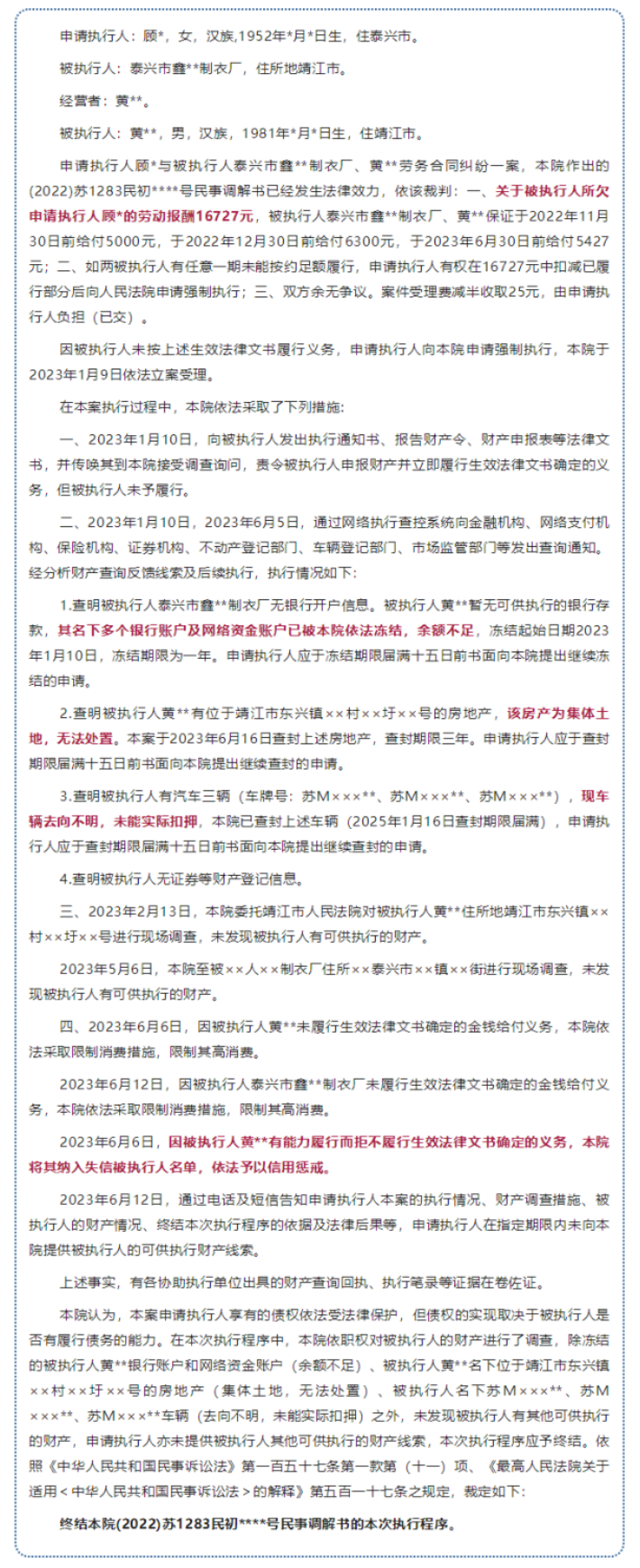 《中華人民共和國勞動(dòng)法》規(guī)定 工資必須在用人單位與勞動(dòng)者約定的日期支付 付出辛勤勞動(dòng)后及時(shí)拿到報(bào)酬 是每一名勞動(dòng)者的愿望 但是有時(shí)卻事與愿違 在現(xiàn)實(shí)生活中 不少企業(yè)會(huì)出現(xiàn)拖欠勞動(dòng)者工資的情況 近日 中國裁判文書網(wǎng)公布的一則執(zhí)行裁定書顯示 泰興一老板就因此 被納入了失信被執(zhí)行人名單 被法院依法采取限制消費(fèi)措施 限制其高消費(fèi) 一起來看具體情況