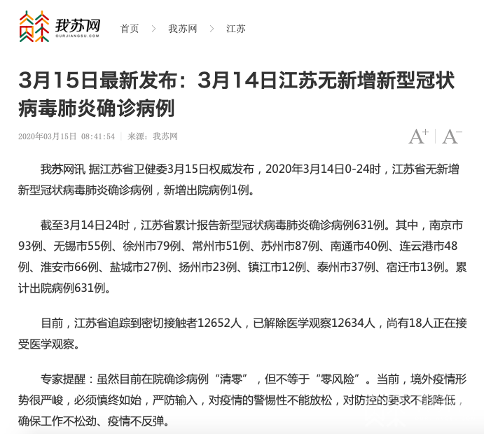 官宣:“動態清零”!剛剛(3月15日上午8時40分),江蘇省衛健委發布:3月14日0時-24時,江蘇省無新增新型冠狀病毒肺炎確診病例,新增出院病例1例,累計出院病例631例,尚有18人正在接受醫學觀察。目前,江蘇省在院確診病例“清零”。