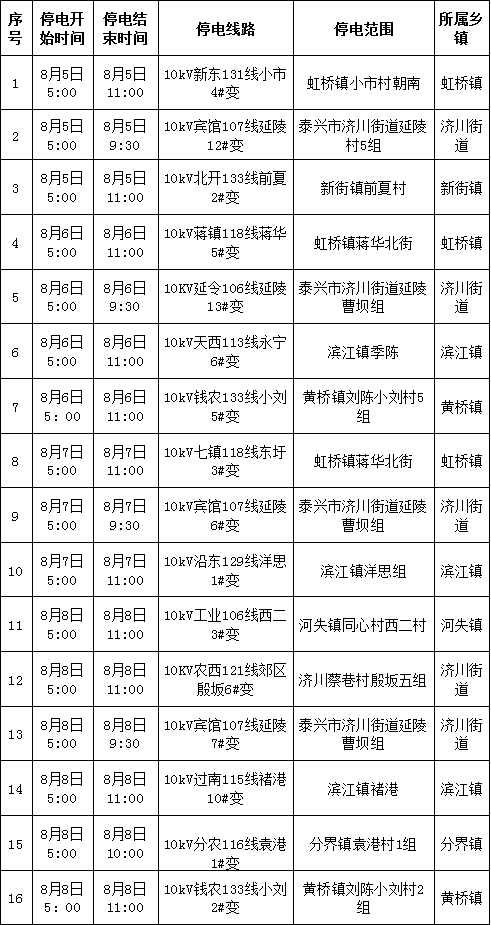 泰興市供電公司停電公告(2019年8月5日-2019年8月11日)