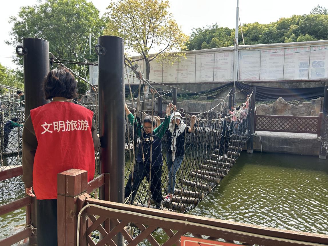 2.志愿者暖心服務,共建有序環境 “您好,景區內請勿攀折花木,感謝您的配合!”“小朋友們,水邊危險,請有序排隊游玩”。活動中,志愿者身著統一紅馬甲,分組在景區入口、兒童游樂區等人流密集處開展文明勸導。志愿者化身“文明守護員”,對攀爬文物、刻劃樹木、踐踏花草等不文明行為及時勸阻。倡議廣大游客朋友樹立文明旅游意識,遵守文明行為規范,樹立文明、健康、綠色旅游新風尚。