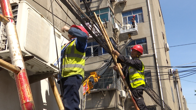 5月9日上午,在延令街道亞太新村小區,施工人員正在辨別抽取、剔除小區內廢棄不用的各類弱電線路,并將剩余線路捋直、綁扎整齊。同時利用登高車,剪除縱橫交錯的跨樓飛線,并對入戶線路進行歸集,沿墻固定。通過整治,取締“飛線”充電,消除安全隱患。