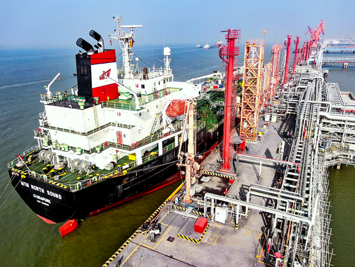 近期,新浦化學(xué)(泰興)有限公司萬(wàn)噸級(jí)液體化工碼頭上也開始忙碌起來(lái)。隨著一艘外輪停靠泊位,碼頭上的裝卸臂便徐徐伸展開來(lái),用“觸角”一樣的接頭去尋找船舶管道上相應(yīng)的法蘭,自動(dòng)對(duì)接上去,開始執(zhí)行這一船燒堿的裝載任務(wù)。