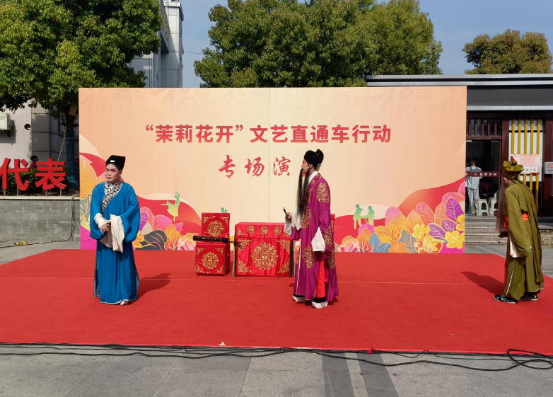 4月8日下午2時,江蘇省演藝集團揚劇團“茉莉花開”文藝直通車駛入中國歷史文化名鎮——泰興市黃橋鎮,在30℃的春日驕陽下,為當地群眾獻上一場兼具傳統韻味與現代風采的露天文化盛宴。盡管熱浪襲人,數百名觀眾仍齊聚廣場涼亭區,以掌聲與歡呼聲回應演員們的傾情演出。經典與創新交融老戲臺煥發新活力演出以氣勢磅礴的吹打樂《校場比武》拉開序幕,康賀、賈建銀等六位演奏家以鑼鼓笙簫再現古戰場雄渾氣象,鏗鏘樂聲瞬間點燃現場氛圍。隨后,天津衛視《王者歸來》鄧麗君模仿秀亞軍劉佳寧以甜潤聲線連唱《小城故事》《甜蜜蜜》三首金曲,引得觀眾齊聲合唱,涼亭內外宛若懷舊音樂廳。