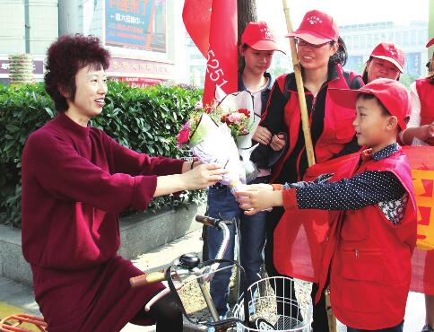 5月14日是母親節,濟川街道躍進社區組織生態泰興服務中心志愿者義賣鮮花,將所得款項捐贈給市聾兒語訓康復中心。